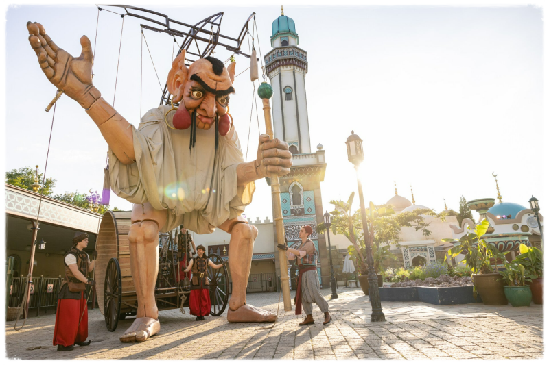 Op het Fata Morgana Plein sta je oog in oog met de reusachtige Djinn. Deze zes meter grote schatbewaker van de Sultan komt een kijkje nemen buiten de paleismuren van Fata Morgana. Maar wees gerust, bekwame wachters proberen de gigant in bedwang te houden.