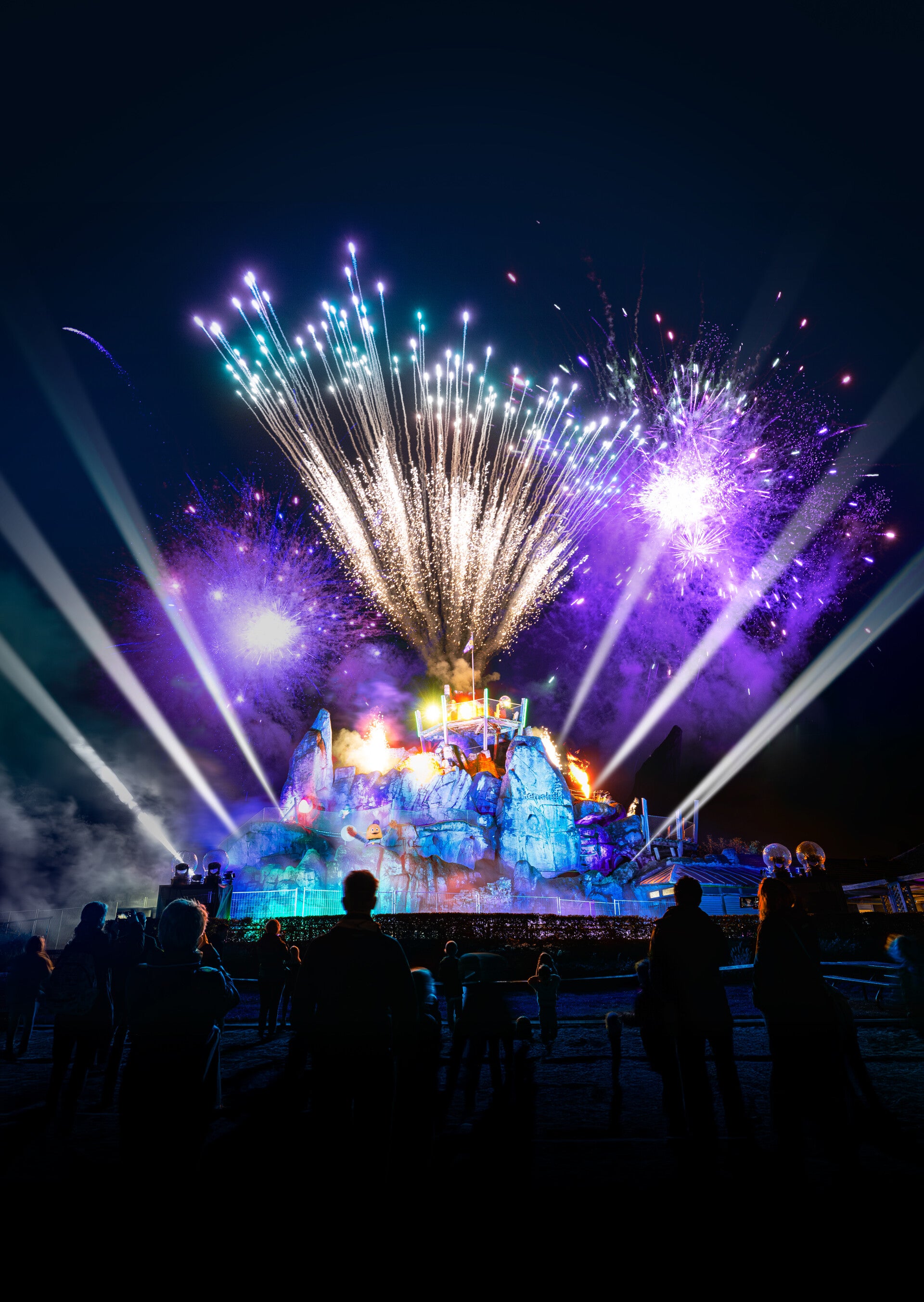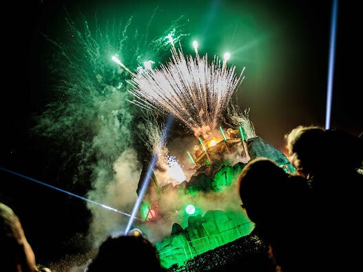 Avondopenstelling van attracties, sfeervol verlicht voor een unieke en magische beleving.